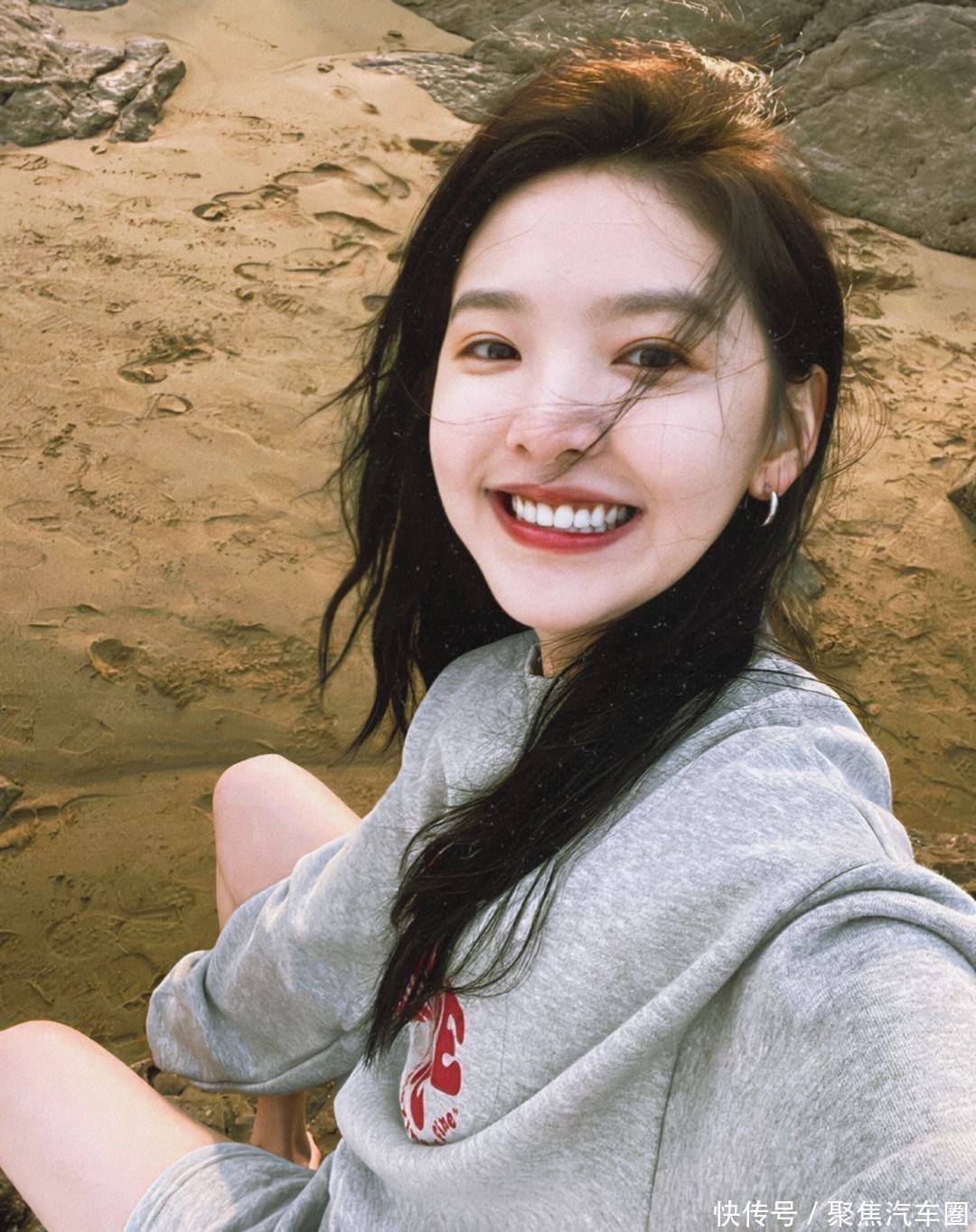 章若楠穿戴灰色衣裤,她坐在沙滩边上,明眸善睐很可东谈主,乌黑秀发随风洒脱,回眸一笑百媚生!